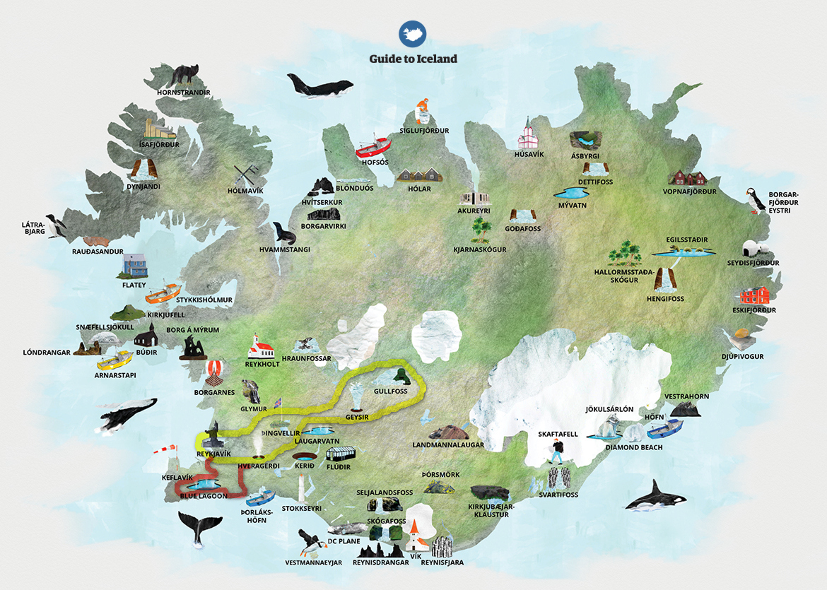 - Þingvellir – park narodowy, miejsce styku dwóch płyt kontynentalnych. Obszar aktywny sejsmicznie jak i wulkanicznie, położony nad największym jeziorem na wyspie.