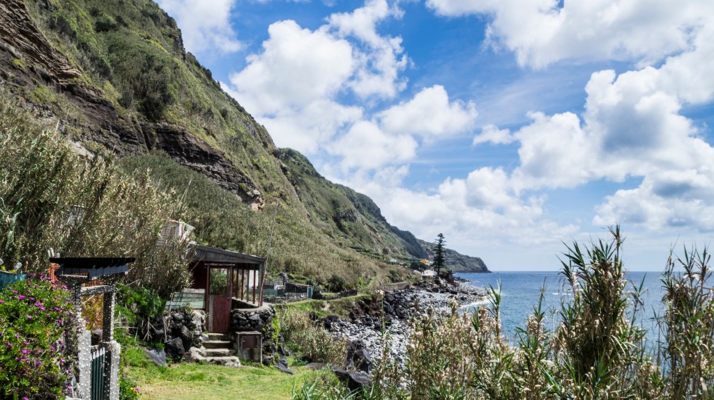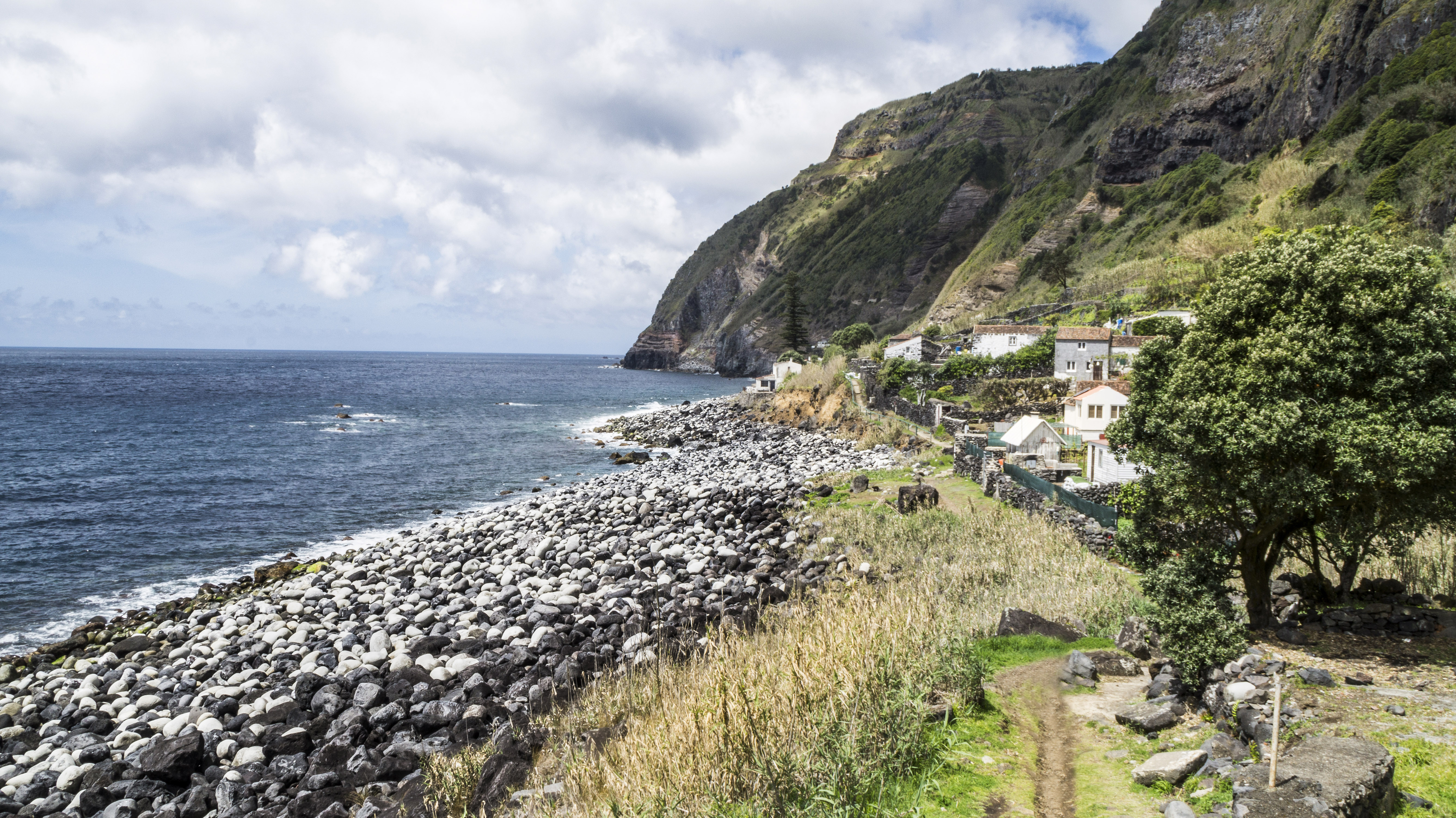 Krętą drogą schodzimy coraz niżej, mijamy kolejne zabudowy, które fascynują położeniem na klifie. Wreszcie dochodzimy do większego skupiska domków leżących w najniższej partii klifu. Tam możemy rzucić okiem na kapliczkę Matki Boskiej (Altar de Nossa Senhora dos Anjos) czy uzupełnić zapasy w źródełku z krystalicznie czystą wodą. Po kilkunastu minutach dochodzimy do końca szlaku, a jest nim dosłownie czyjaś posiadłość. Dalej nie pójdziemy, więc pozostaje nam cofnąć się kilkanaście metrów na kamienistą plażę i odpocząć przed drogą powrotną.