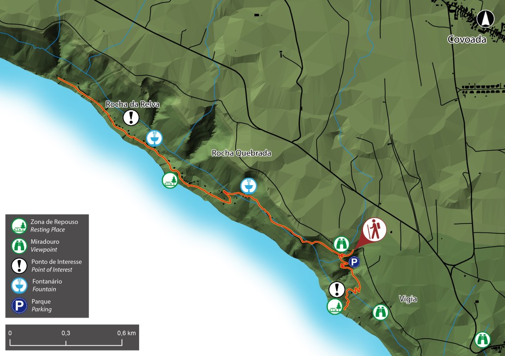 Szlak znajduje się na wzgórzu za miastem Relva, dlatego aby dostać się na jego początek należy przejść kawałek przez miasteczko, a następnie przez pola uprawne i gospodarstwa. Po drodze mija się punkt widokowy Miradouro da Vigia.