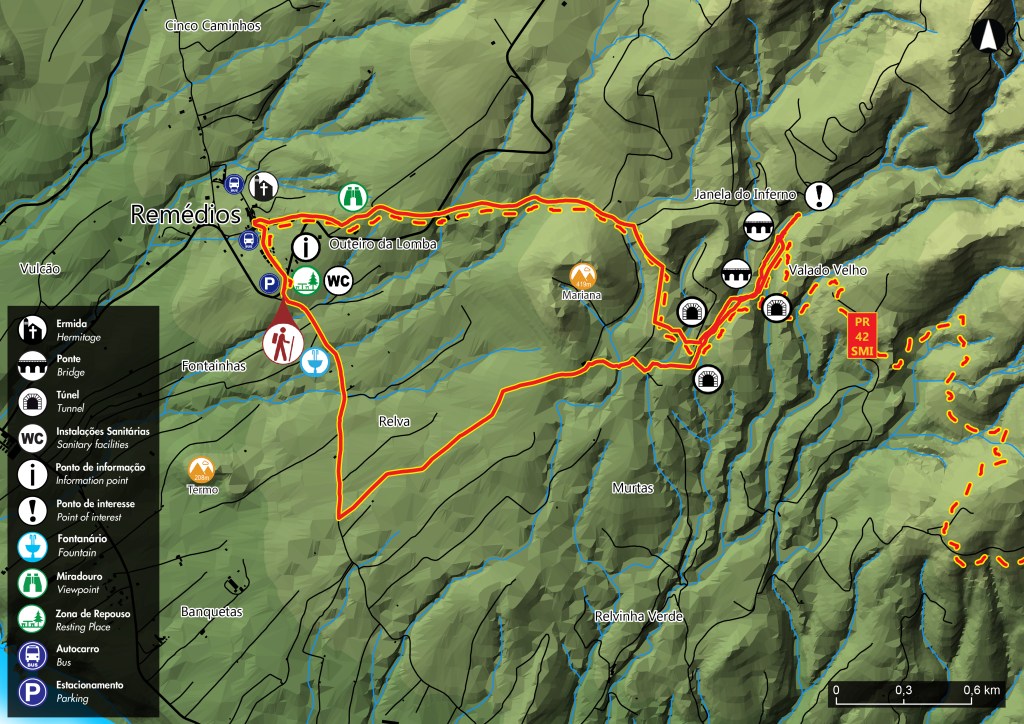 Droga prowadzi przez pola i tylko lekko pod górę. Szlak jest łatwy i przyjemny. Mijamy charakterystyczne dla azorskiego krajobrazu zielone wzgórza i pola z pasącymi się stadami krów. Na trasie szlaku znajduje się kilka tuneli wzdłuż jego długości, dlatego wskazane jest, aby mieć ze sobą latarkę. Po pokonaniu kilku kilometrów przez pola dochodzimy do pierwszej jaskini. Robi wrażenie swoim położeniem, czyni ten szlak jeszcze ciekawszym. Szlak przechodzi dalej przez akwedukt w kształcie tunelu, około 50 m długości. Stąd przekraczamy kilka kolejnych imponujących akweduktów, które zaopatrywały starą fabrykę alkoholową Lagoa i obecnie dostarczają wodę do gminy. I nareszcie dochodzimy do kluczowego punktu szlaku – Janela do Inferno (okno do piekła). Tutaj robimy sobie krótką przerwę na regenerację i zdjęcia, a następnie wracamy inną drogą, wzdłuż lewego brzegu Ribeira Seca.