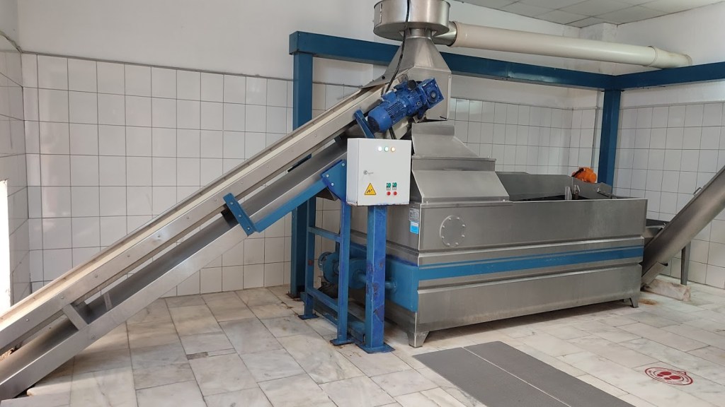 1. Oliwki się myje. Rozdzielone owoce od gałązek i liści trafiają do maszyny, która robi z nich miazgę.