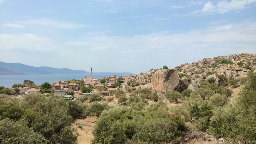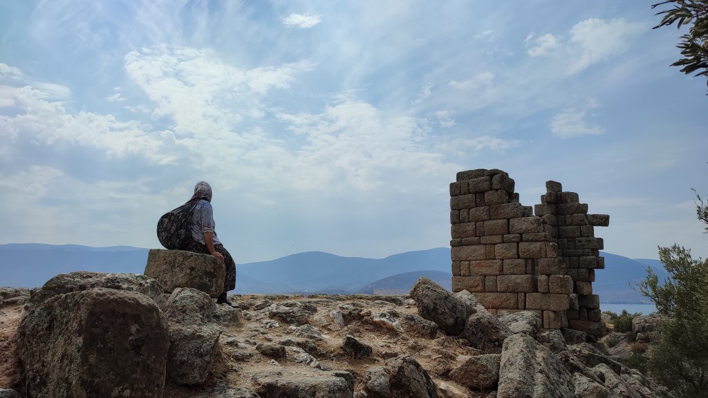 Chwila zawahania. Droga ciasna, nie ma jak zawrócić. Pomyślałem sobie, że babcie to raczej mnie nie okradną… chyba. Ruszyłem więc za wesołą gromadką. Przeciskałem się pomiędzy zabudową, ale ani przez chwilę żadna z moich nowych przewodniczek nie wątpiła w to, że się zmieszczę. Ostatecznie doprowadziły mnie do miejsca, gdzie dalej i tak bym już nie pojechał. Parkuję, gaszę silnik, wysiadam. Lekko zdezorientowany pytam, czy auto tutaj może stać. W odpowiedzi jednogłośnie słyszę- problem yok (nie ma problemu), free! free… ale chodź za nami pokażemy. Rozglądam się w lewo, rozglądam się w prawo, myślę sobie – a co mam do stracenia? Wzruszam ramionami i ruszam dalej pieszo. Jak się okazało panie, które jak na podeszły wiek wyglądające po skałkach, które się zaczęły przed nami piętrzyć, skakały niczym kozice. Doprowadziły mnie w miejsce skąd roztaczał się piękny widok na całą wieś, antyczne miasto i ruiny świątyni Ateny. Chwytam za aparat, robię kilka zdjęć, odwracam się… i co widzę? Kram! Każda z nich nie wiedzieć kiedy rozłożyła się ze swoim towarem. Myślę sobie- Oho! Albo spadnę z tej pięknej skałki albo ubezpieczyciel będzie sączył pytania o auto. Jaki mam wybór? Od każdej z nich, by żadnej nie urazić, kupuję jakąś jedną rzecz. Własnoręcznie pleciony łańcuszek, jakąś chustę, plecionkę na nadgarstek… Lekko niezadowolone małymi zakupami, ostatecznie życzą mi miłego dnia i wracają w stronę wioski.