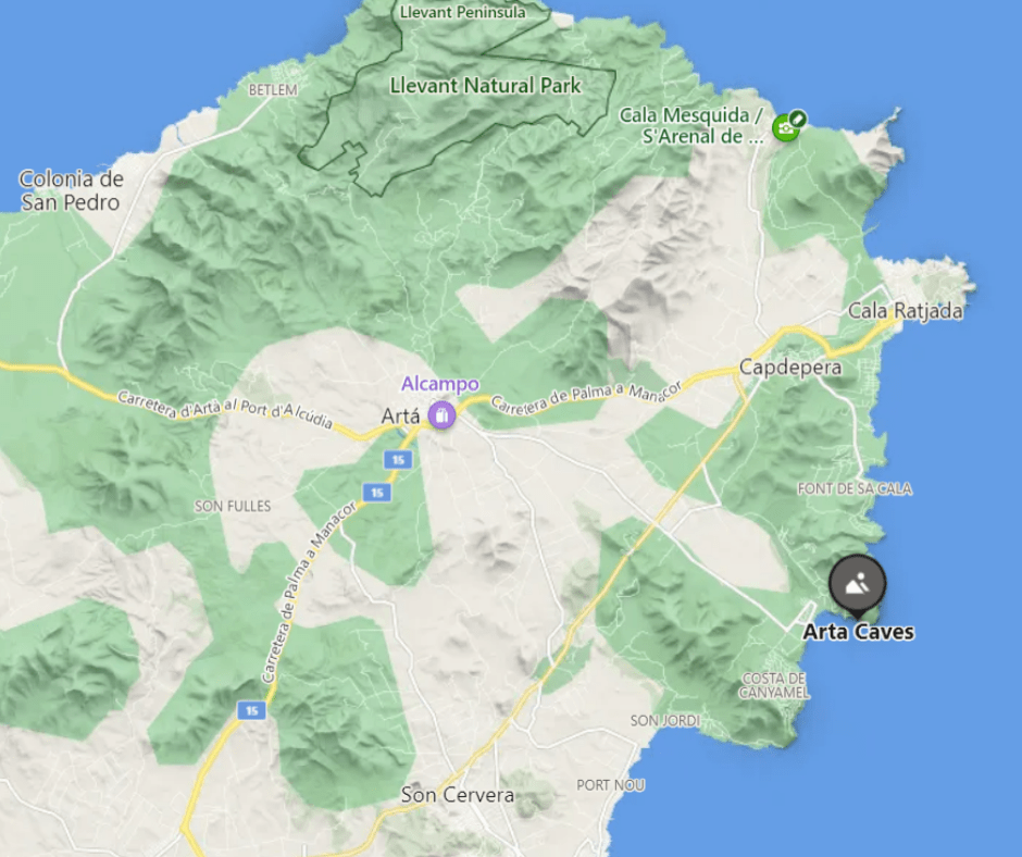 Majestatyczne Jaskinie Arta z jakiegoś powodu ugrzęzły w cieniu Smoczych Jaskiń. Nie mniej piękne i nie mniej oszałamiające. Zwiedzanie (wyłącznie) z przewodnikiem trwa około godziny. Przechodzimy przez całą jaskinie, po kolei penetrując nowe to pomieszczenia, gdzie dla przykładu jednym z ciekawszych pomieszczeń jest tak zwany „czyściec”. Przewodnik opowiada o zadziwiających formacjach skalnych, które potrafią być datowane nawet na 5 mln lat wstecz. Doświadczymy tam również pokazu świetlnego połączonego ze zdumiewającą muzyką. Przed samym wejściem znajduje się skromny parking, większy natomiast oddalony jest o 3 minuty spacerem. Gdybyśmy zdecydowali się na dojazd autobusem, czeka nas wtedy 15/20 minutowy spacer od przystanku końcowego w Canyamel.