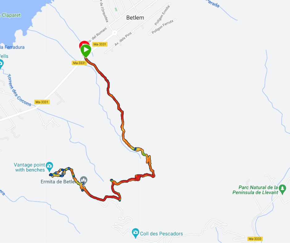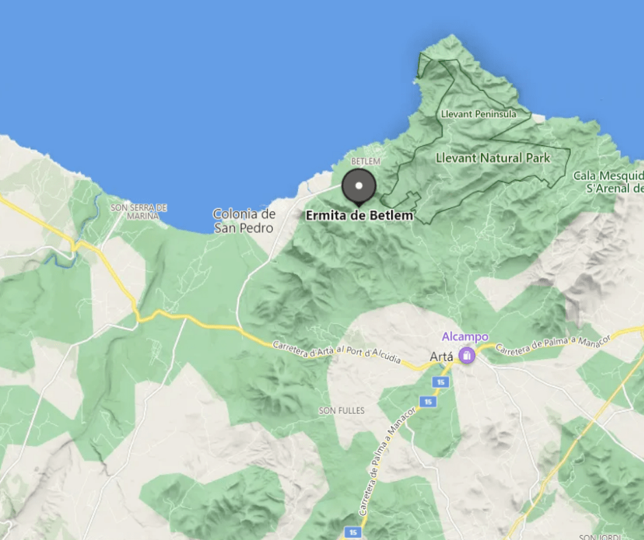 Szlak prowadzący nas do Eremita de Betlem rozpoczyna się tuż przy głównej drodze wiodącej do Betlem (choć równie dobrze można tam dojść, bądź dojechać od strony Parku Naturalnego Levantu). Szlak początkowo prowadzi nas po płaskim terenie by chwile później piać się ku pobliskim wzniesieniom. Już po kilku chwilach zaczynają nas otaczać coraz to piękniejsze widoki. Do kościółka na końcu szlaku dojdziemy w niespełna godzinę. Tuż przed kościołem znajduje się parking (do którego można dojechać od strony Arty) oraz toalety. Kościółek jest mały i skromny jednak mimo wszystko całkiem ładny. Po wyjściu z kościoła nie ma co osiadać na laurach, bo tuż na jego tyłach rozpoczyna się nieco „dziksza” ścieżka, która prowadzi nas ciut wyżej. Kierując się krawędzią zniesienia dochodzimy to wieżyczki obserwacyjnej, w której cieniu na spokojnie możemy podziwiać przepiękny widoki (gór Serra de Tramuntana na horyzoncie, zatokę Alcudii, Betlem tuż u naszego podnóża oraz szczyt Sa Tudossa tuż naprzeciw nas). Choć nie jest to ciężki szlak, to do najprostszych też nie należy, jednak widoki, które nas czekają na końcu – wynagradzają każdą kroplę potu.