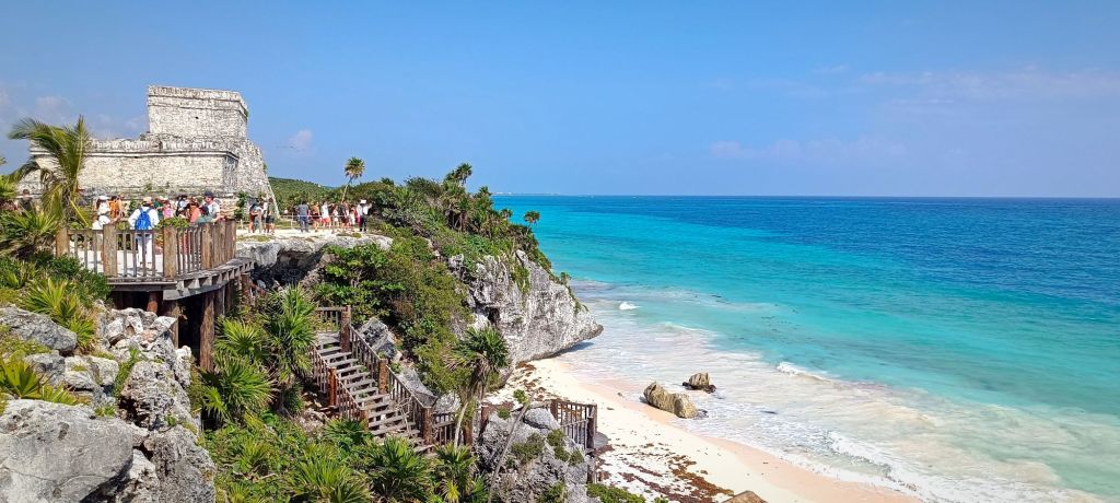 Tulum to jedyne miasto Majów wybudowane nad samym Morzem Karaibskim. Kontrast między soczystą zielenią trawy, błękitem morza a złocistymi piaskami u podnóża klifów robi ogromne wrażenie. Jednak magia tego miejsca może zniknąć w mgnieniu oka przy pochmurnej, wietrznej pogodzie – stąd jego miejsce dopiero na piątej pozycji. Odwiedzając Tulum, warto przejść się nie tylko po centralnej części ruin, ale także wzdłuż klifowej trasy spacerowej, skąd roztaczają się malownicze widoki, dojść do „latarni” majów. Wizyta obejmuje również Park Jaguarów, za którego wstęp i tak trzeba zapłacić przy wejściu do ruin.