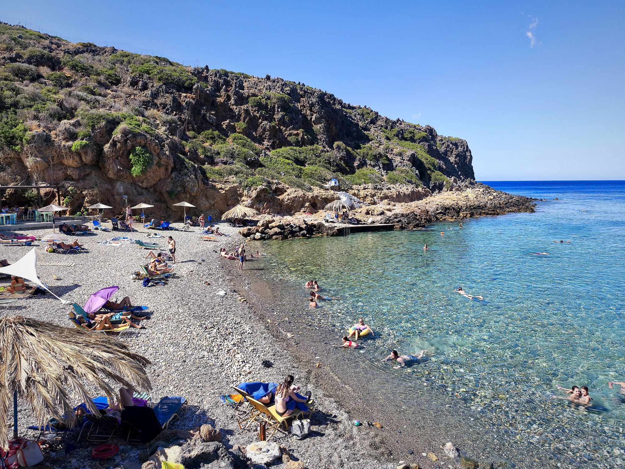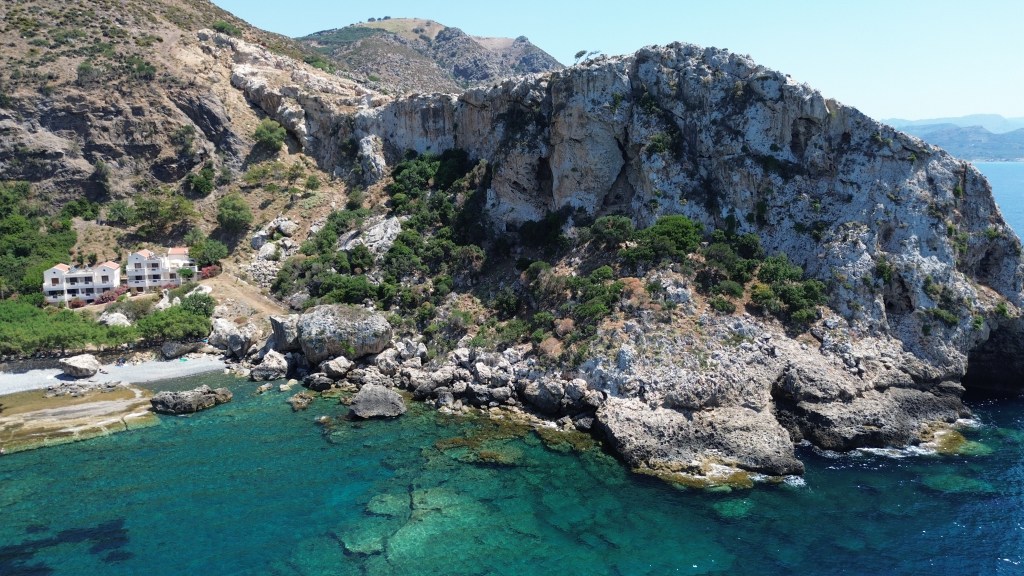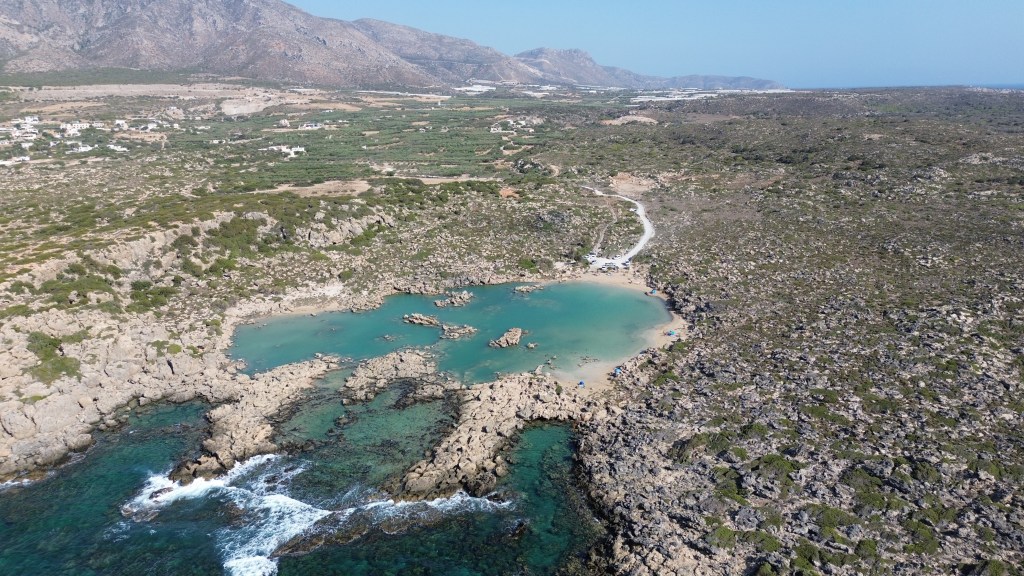 Cicha i spokojna, kamienista plaża z parkingiem tuż obok i tawerną z barem przy samym brzegu. Na miejscu znajdziemy też przebieralnie, prysznice i leżaki, co czyni ją wygodnym miejscem na relaks po zwiedzaniu. To idealne miejsce dla miłośników snorkelingu – krystalicznie czysta woda i skaliste dno gwarantują świetne warunki do obserwacji podwodnego świata. Sama trasa prowadząca do plaży jest bardzo widokowa, a dojazd z Chanii zajmuje około 35 minut w kierunku wschodnim.