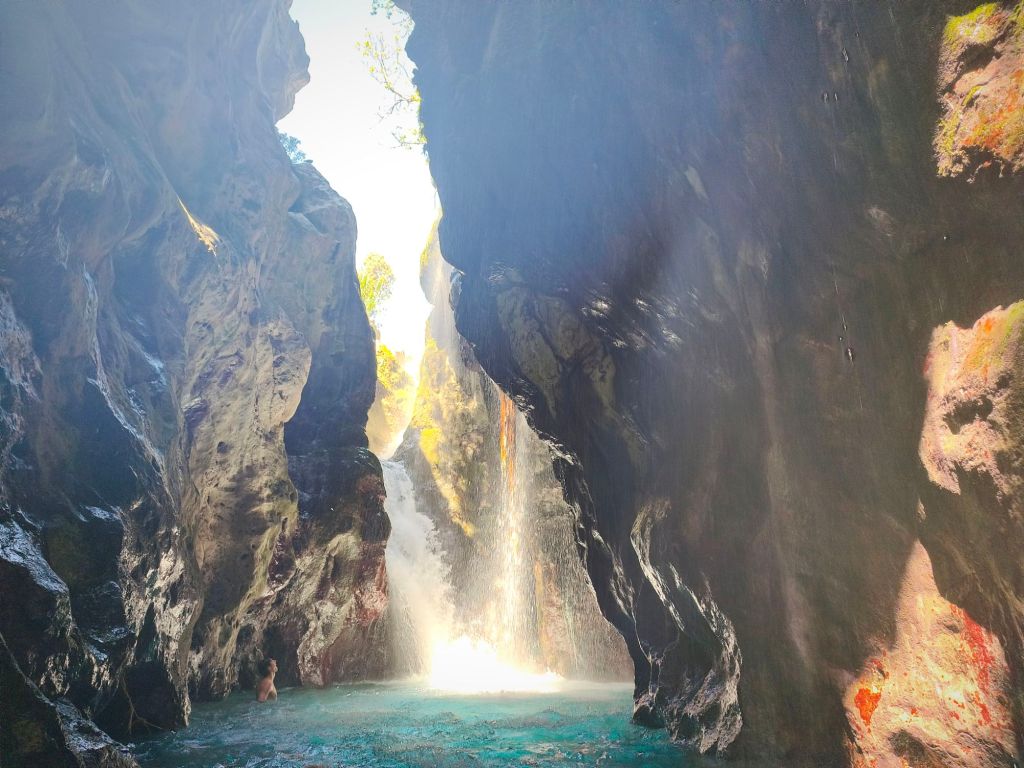 Chociaż plaża Preveli w sezonie letnim cieszy się ogromną popularnością, urok lasu palmowego przy ujściu górskiej rzeki Kissano Faraggi wynagradza tłok i gwar. Dodatkowo, zaledwie 20 minut od plaży można zejść do wąwozu Kourtaliotiko, gdzie po krótkiej przeprawie odkryjemy słynny wodospad. Podczas planowania wizyty przy wodospadach warto zaopatrzyć się w wodoodporne opakowania lub cokolwiek, co ochroni nasze rzeczy przed zamoczeniem. Do wodospadu widocznego na zdjęciu poniżej trzeba przepłynąć około 10 metrów w górskiej, lodowatej wodzie – warto to uwzględnić, planując wizytę. Mimo wszystko naprawdę warto się tam wybrać, bo na końcu czeka po prostu bajeczny widok. Wstęp do wąwozu to koszt 5 euro za osobę dorosłą i 3 euro za dzieci.