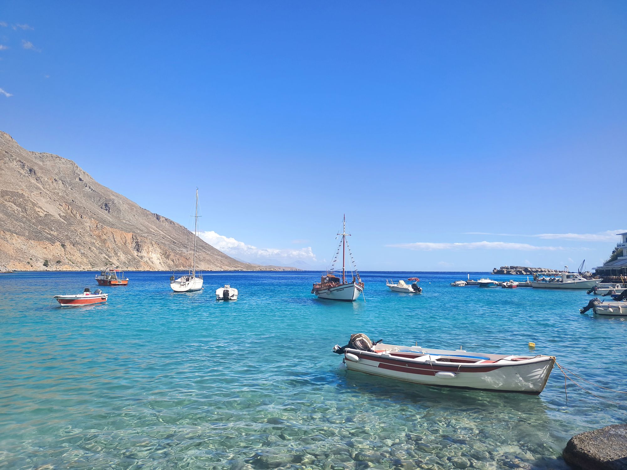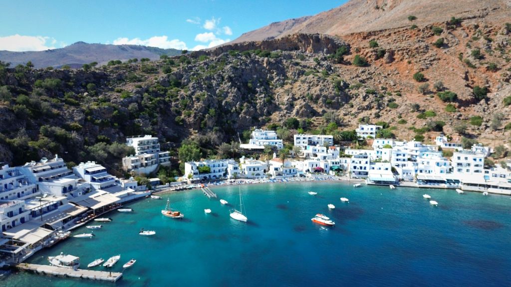 Prawdziwa perełka skryta u podnóża gór, tuż nad Morzem Libijskim. Cicha, spokojna wioska, jak wyjęta z plakatów i broszur biur podróży. Do Loutro nie dojedziemy autem – nie prowadzi tam żadna droga. Jedyną opcją dotarcia jest rejs z pobliskich miejscowości (Hora Sfakion, Agia Roumeli, Sougia, and Palaiochora) kursującą łodzią (rozkład znajdziecie tutaj, sugerowana trasa z Hora Sfakion) albo kilkunastokilometrowy trekking górskim szlakiem (link tutaj). Jedno jest pewne – Loutro zachwyca i trudno znaleźć kogoś, kto by temu zaprzeczył.