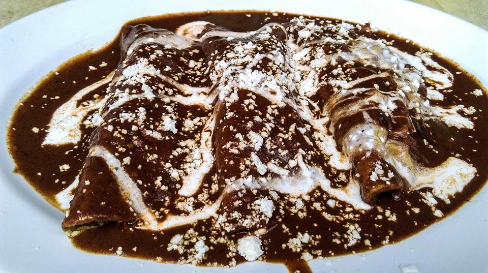 Jest to pyszna tortilla wypchana kurczakiem (czasem można znaleźć z innym rodzajem mięsa), zawinięta, oblana przepyszną salsą (w tym przypadku jest to Enchilada Mole*), posypana serem i oblana śmietanką. Palce lizać!!!