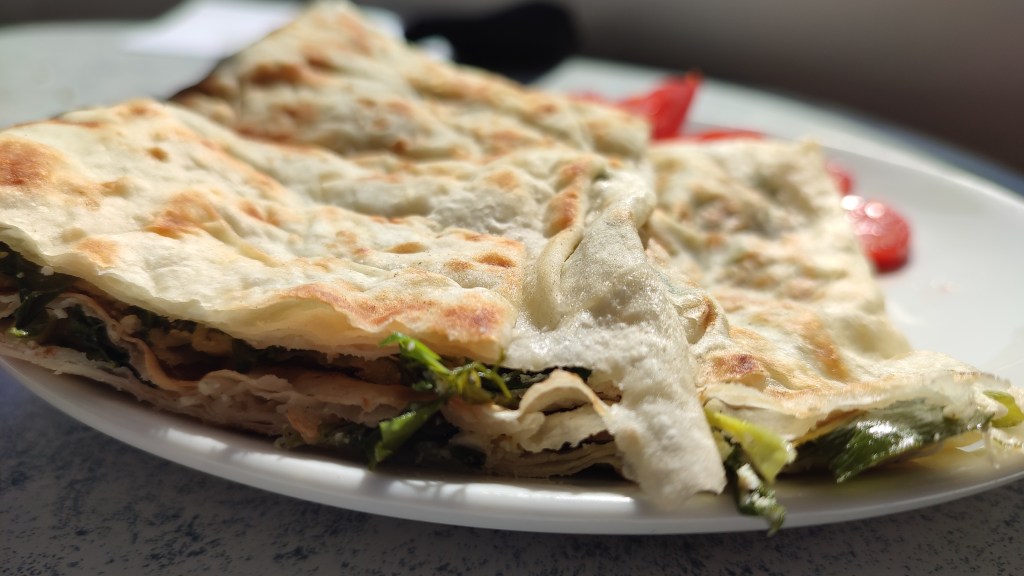 Gözleme – tureckie naleśniki z bardzo cienkiego ciasta, wypełnione przeróżnymi dodatkami np. ser i szpinak/ mięso/ ziemniaki/ czekolada/ masło orzechowe. Cena 15-20 lir